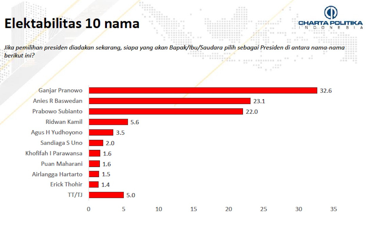 JPNN.com, JAKARTA – Lembaga Charta Politika merilis hasil survei terbarunya tentang elektabilitas 10 nama kandidat calon presiden atau capres.